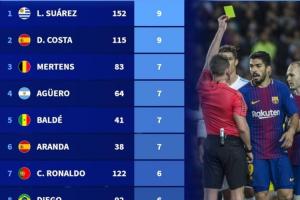 德轉列前10聯賽假摔染黃次數榜:蘇牙&科斯塔9黃第一,C羅6黃上榜