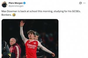體育資訊03月16日訊 今天是周一,英國名嘴、著名阿森納球迷皮爾斯·摩根社媒發(fā)帖,調(diào)侃阿森納16歲小將道曼今天還要去上學(xué)。