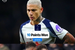 據媒體統計,熱刺本賽季主場僅拿到10分,在英格蘭前四級別聯賽的92支球隊中,只有謝周三本賽季的主場積分(9分)少于熱刺。