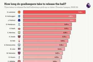 英超各隊(duì)門將平均拿球/撲救后球出手時(shí)間: