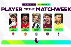英超官方本輪最佳球員候選:道曼、B費、里沙利松在列