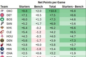 體育資訊3月17日訊 今天,數(shù)據(jù)分析師Dean Oliver統(tǒng)計(jì)了本賽季聯(lián)盟各隊(duì)首發(fā)陣容和替補(bǔ)陣容的凈效率(百回合凈勝分)。