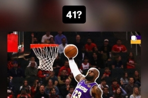 賽后,拉拉維亞轉發(fā)了詹姆斯的一張騰空海報,并寫道:“41歲?”