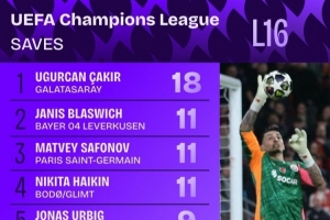 據Squawka統計,加拉塔薩雷門將恰基爾對陣利物浦兩回合做出18次撲救,包括撲出薩拉赫的點球,本屆1/8決賽撲救次數最多。恰基爾次回合比賽做出11次撲救,近10個賽季歐冠淘汰賽單場撲救次數最多。