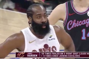 哈登本賽季50次造成三分球犯規(guī)領(lǐng)跑全聯(lián)盟 加入騎士之后已經(jīng)9次