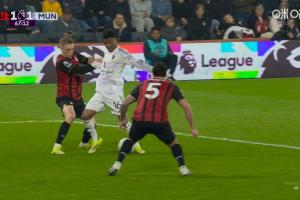是點球嗎?阿瑪德禁區內倒地裁判沒有表示,伯恩茅斯反擊扳平