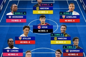 前鋒:迪奧曼德(萊比錫,7500萬(wàn)歐)、阿德耶米(多特,5000萬(wàn)歐)、勒威林(斯圖加特,4000萬(wàn)歐)