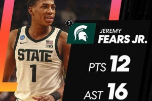 體育資訊3月22日訊 今日NCAA瘋?cè)?2強賽,密歇根州立大學(xué)77-69拿下路易斯維爾。