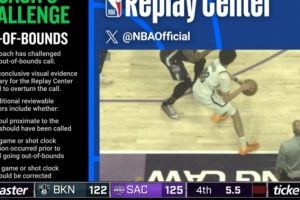 特拉奧雷被兩位裁判同時吹踩線和進攻犯規,籃網挑戰失敗,裁判回放后明顯踩線,還是國王球權