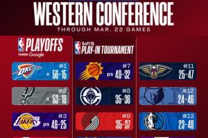 2.西部第五的掘金、第六的森林狼以及第七的太陽今日相繼贏球,其中掘金與森林狼的戰(zhàn)績繼續(xù)持平(同為44勝28負(fù),掘金因交手戰(zhàn)績占優(yōu)排名靠前)。