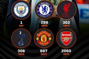 BIG6多久沒拿重要冠軍了?阿森納2060天,曼聯667天,熱刺306天