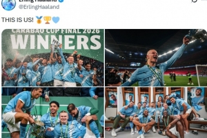 哈蘭德社媒曬與隊友慶祝奪冠合照,配文:這就是我們??????