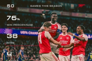 阿森納社媒曬本賽季50場比賽戰績:38勝8平4負,勝率高達76%
