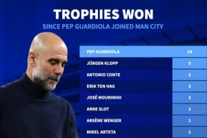 自瓜帥入主曼城以來斬獲14座獎杯,占英超俱樂部所獲獎杯總數39%