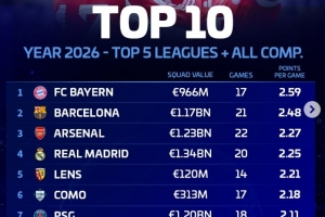 體育資訊3月24日訊 德轉(zhuǎn)盤點(diǎn)了2026年五大聯(lián)賽球隊(duì)在各項(xiàng)賽事場均積分榜,其中拜仁居首,具體如下:
