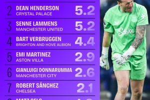 本賽季英超門將阻止進球榜:皮克福德6球居首,拉門斯5.2球