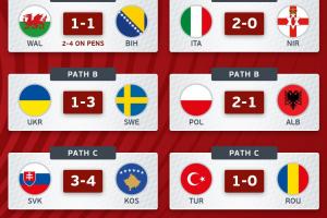 體育資訊3月27日訊 世預賽歐洲區附加賽結束半決賽爭奪,意大利、瑞典、土耳其、丹麥等隊晉級,各路徑決賽對陣為波黑vs意大利、瑞典vs波蘭、科索沃vs土耳其、捷克vs丹麥。