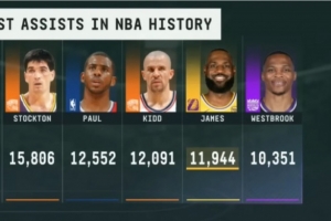 據統計,詹姆斯生涯至今共送出11944次助攻,排名歷史第4,距離第三的基德僅差不到150次(147次)。