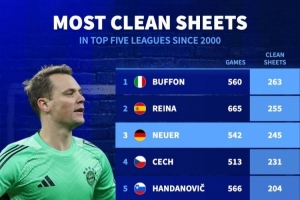 2000年以來五大聯賽門將零封榜:布馮263場居首,雷納、諾伊爾前3