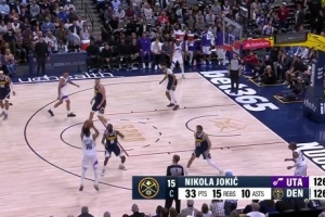 比賽進行到關鍵時刻,掘金球星約基奇助攻卡梅隆·約翰遜命中底角三分球終于追平比分,同時自己的數據來到33分15籃板10助攻的三雙。