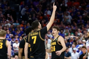 當(dāng)完賽的蜂鳴器響起的瞬間,愛荷華大學(xué)的隊(duì)員們互相擁抱慶祝,他們淘汰了衛(wèi)冕冠軍佛羅里達(dá)大學(xué),自1999年以來(lái)首次晉級(jí)甜蜜十六強(qiáng)。