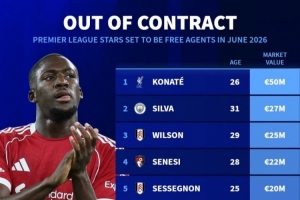 合同今夏到期英超球員身價排名: