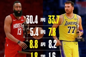 東契奇本季場(chǎng)均33.7分7.8板8.2助 MVP賽季哈登30.4分5.4板8.8助