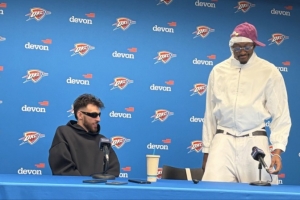賽后,雷霆球員杰倫·威廉姆斯和霍姆格倫出席了新聞發布會。兩人著裝配色完全相反,杰倫威調侃道:“全黑和全白,就像陰和陽。”