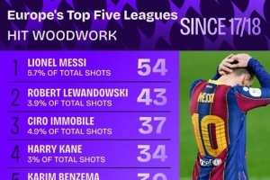 值得一提的是,梅西的5.7%中柱次數(shù)百分比也高居第一。