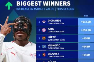體育資訊03月31日訊 德轉盤點了本賽季目前球員身價漲幅榜,其中效力于RB萊比錫的揚·迪奧曼德上漲7350萬歐最多,費爾明身價翻倍成為新的“億元先生”。