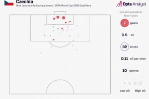 本屆世預賽共通過角球打進7球,捷克位居歐洲區所有球隊之首
