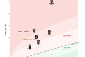 Unethical Hoops的“無(wú)德”指數(shù)主要依靠罰球數(shù)量vs出手?jǐn)?shù)的比值來(lái)進(jìn)行計(jì)算,數(shù)值越大,越是“沒有道德”;
