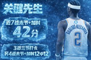 關(guān)鍵先生!亞歷山大近7戰(zhàn)末節(jié)+加時(shí)爆轟42分??12中12一球未丟!