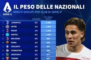 體育資訊4月2日訊 德國轉會市場統計了意甲各隊球員在這個國際比賽日的出場總時間,并列出榜單,尤文、國米、米蘭前三。