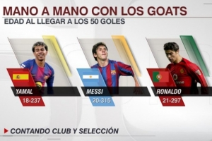 據(jù)統(tǒng)計,18歲237天的亞馬爾生涯各項賽事已經(jīng)打進(jìn)50粒進(jìn)球(俱樂部+國家隊),梅西打進(jìn)生涯50球時為20歲315天,C羅則是21歲297天。