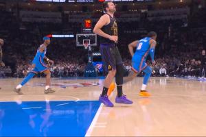 湖人今日客戰(zhàn)雷霆,第三節(jié),東契奇疑似無對(duì)抗腿筋受傷。