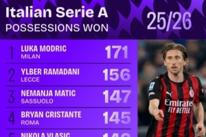 本賽季意甲奪回球權榜:40歲莫德里奇171次第一,馬蒂奇第三