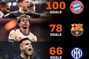 五大聯(lián)賽進球榜:拜仁100球、巴薩78球、國米66球、槍手巴黎各61球