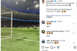 穆勒社媒曬出點射破門的視頻,配文:“補時的點球總是格外特別,現場情緒肯定爆棚。