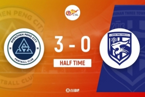 傷停補(bǔ)時4分鐘。上半場比賽結(jié)束,深圳新鵬城3-0武漢三鎮(zhèn)。
