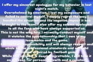 我為自己在昨晚比賽中的行為致以最誠摯的歉意。