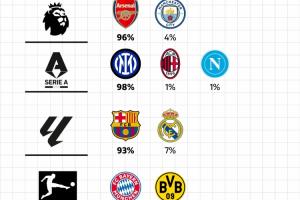 五大聯賽奪冠概率:阿森納96%,拜仁、巴黎99%,巴薩93%,國米98%