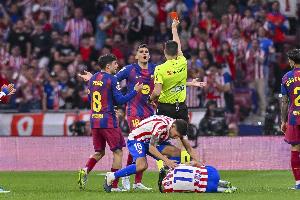 體育資訊4月7日訊 西甲第30輪比賽,巴薩在客場以2-1的比分戰勝馬競。本場比賽,赫拉德·馬丁解圍時踢到阿爾馬達腳踝,主裁判第一時間出示了紅牌,在VAR介入后,他改判為黃牌,這一判罰引進了馬競方面的巨大不滿。