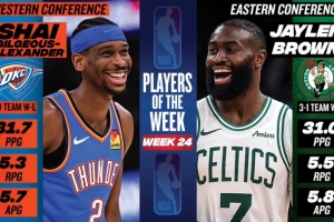 體育資訊4月7日訊 NBA官方公布了25-26賽季第24周的東西部周最佳球員,杰倫·布朗和亞歷山大當選。