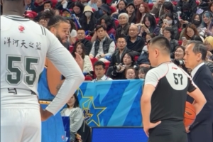 首節(jié)末段,場上出現(xiàn)了一個小插曲,麥基剛登場一回合,比賽就被裁判叫停,原因是麥基佩戴的牙套不合規(guī)定,最終許利民不得不用周琦將麥基換下。