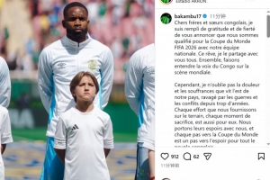 巴坎布社媒曬出自己在國家隊(duì)的照片,并寫道:“親愛的剛果兄弟姐妹們,我懷著無比的感激與自豪向大家宣布——我們的國家隊(duì)已成功晉級2026年世界杯!這個夢想,我與你們所有人共同分享。讓我們攜手在世界舞臺上發(fā)出剛果的聲音。”