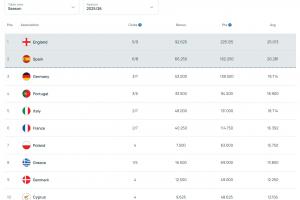 體育資訊04月08日訊 歐足聯(lián)更新了本賽季各聯(lián)賽歐戰(zhàn)積分排名,意甲聯(lián)賽歐戰(zhàn)積分為18.714分,已經(jīng)被葡超反超,跌出歐洲前四聯(lián)賽。