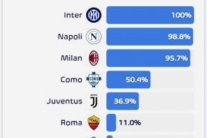 意甲各隊(duì)闖進(jìn)前四概率:科莫50.4%,尤文36.9%,羅馬僅11%