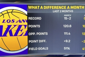 三月湖人的戰(zhàn)績是15勝2負(fù),場(chǎng)均得到120.6分,失分111.4,凈勝分+9.2,命中率51%;