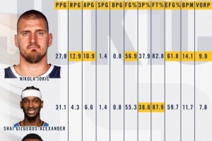 約基奇在場均籃板、助攻、投籃命中率、有效命中率、基礎正負值(BPM)和替代球員價值(VORP)六項數據方面都排在四位MVP候選人中的首位。